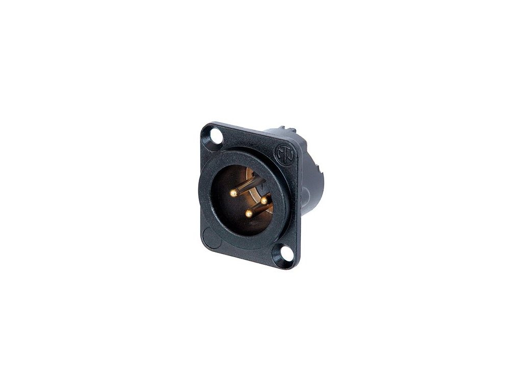 Panelowe 3-pinowe gniazdo XLR, męskie. Metalowa obudowa, pozłacane styki, kubki lutownicze, czarny kolor.
