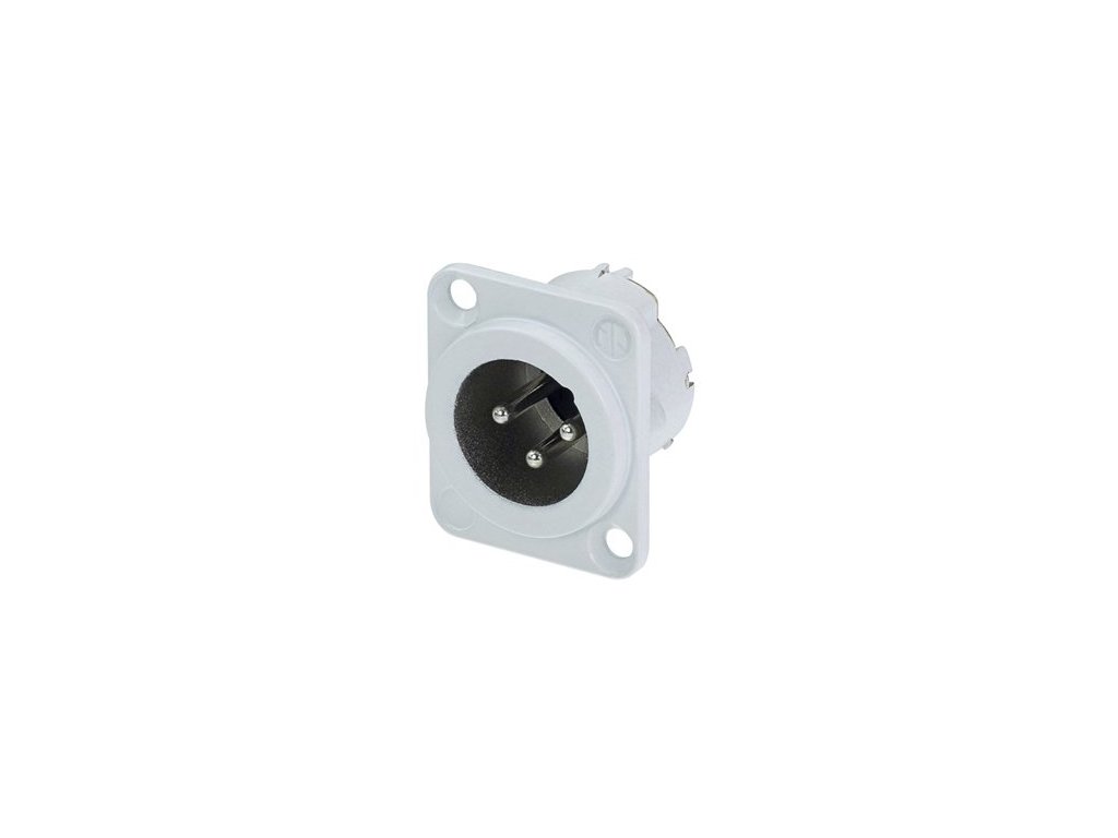 Panelowe 3-pinowe gniazdo XLR, męskie. Metalowa obudowa, posrebrzane styki, kubki lutownicze, biały kolor.