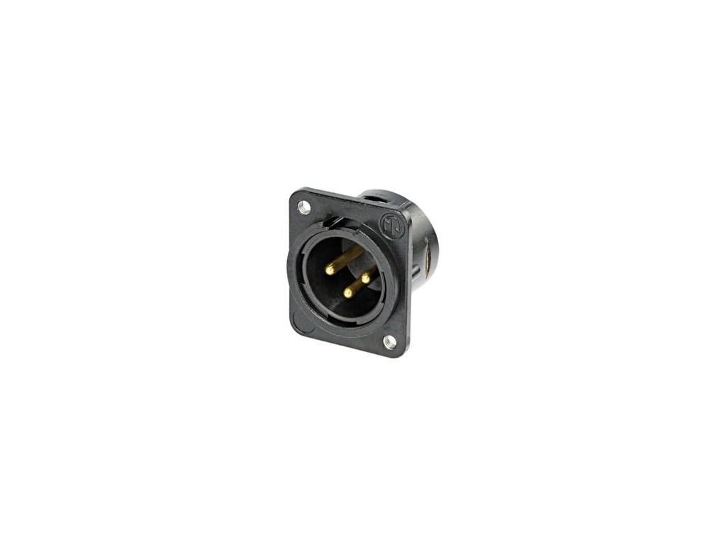 Panelowe 3-pinowe gniazdo XLR, męskie. Metalowa obudowa D-size, pozłacane styki, kubki lutownicze, otwory montażowe M3, kolor czarny.