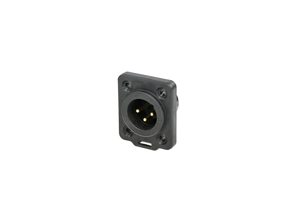 Panelowe 3-pinowe gniazdo XLR, męskie. Wytrzymała obudowa z tworzywa sztucznego, do użytku na zewnątrz, pozłacane styki, wersja lutowana.