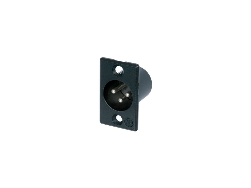 Panelowe 3-pinowe gniazdo XLR, męskie. Metalowa obudowa, posrebrzane styki, kubki lutownicze, czarny kolor.