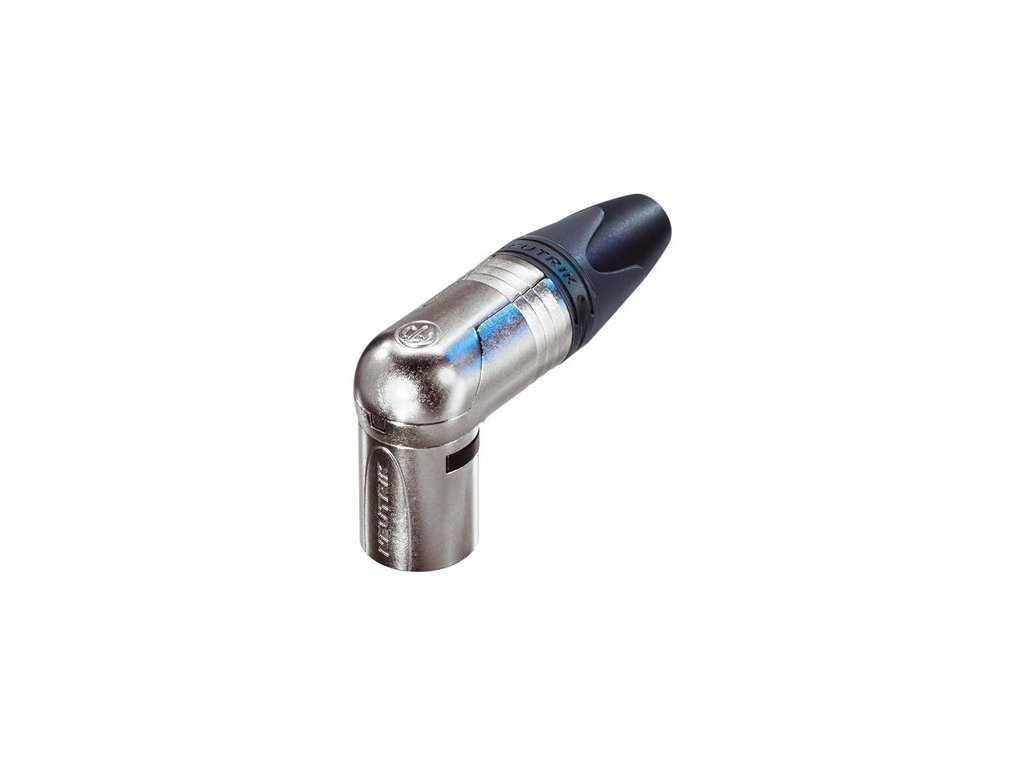 Kątowe 3-pinowe złącze kablowe, męskie. Metalowa obudowa, posrebrzane styki, kolor srebrny.