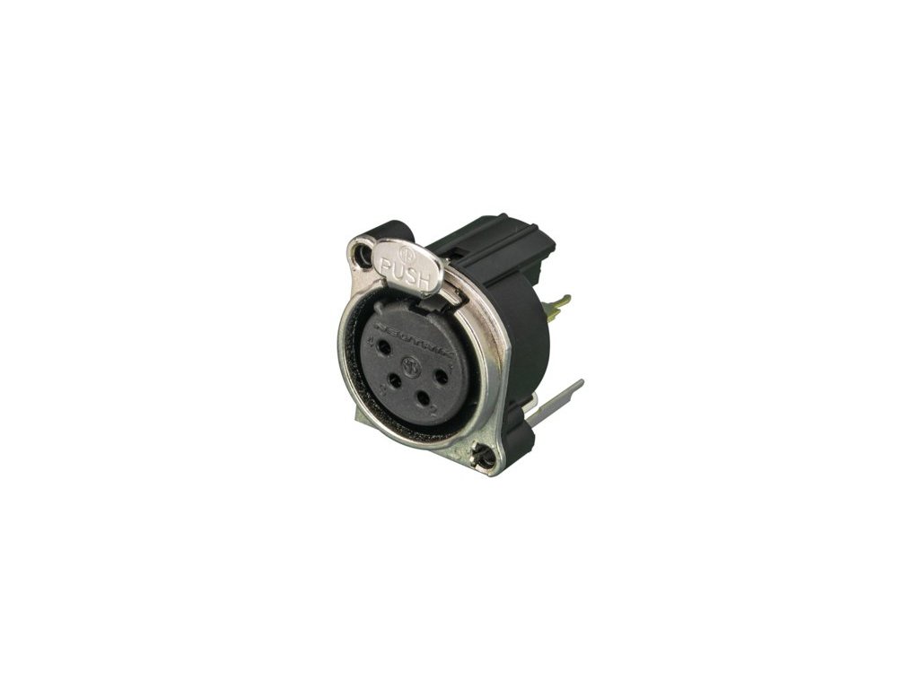 Panelowe 4-biegunowe gniazdo XLR, żeńskie. Uziemienie: oddzielny styk uziemiający na obudowie wtyczki i panelu przednim. Plastikowy korpus z metalowym kołnierzem, wersja z zatrzaskiem, pionowy montaż na PCB.