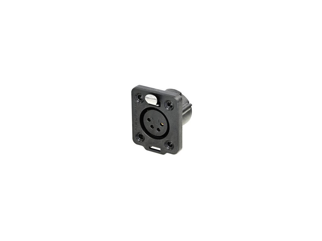 Panelowe 4-biegunowe gniazdo XLR, żeńskie. Wytrzymała obudowa z tworzywa sztucznego, do użytku na zewnątrz, pozłacane styki, wersja lutowana.