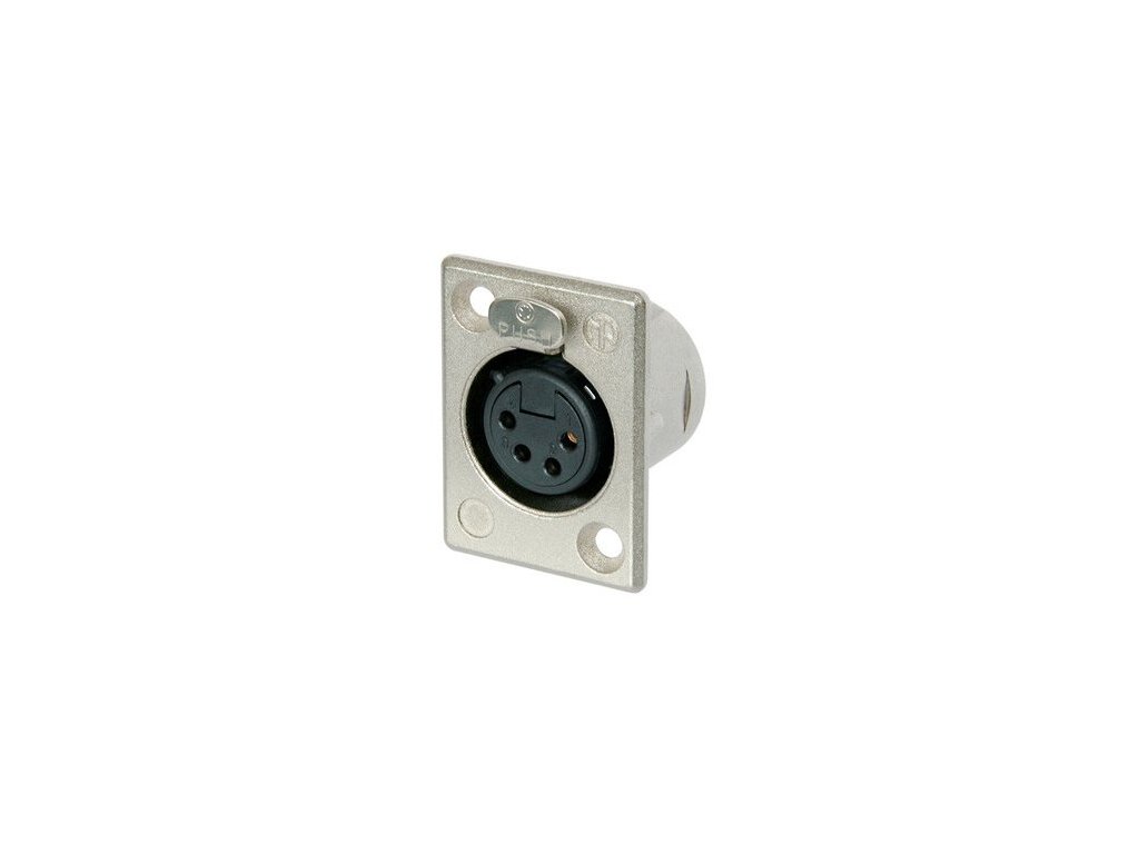 Panelowe 4-biegunowe gniazdo XLR, żeńskie. Metalowy, niklowany korpus, posrebrzane styki, zaciski lutownicze, srebrny kolor. Wersja z zatrzaskiem.