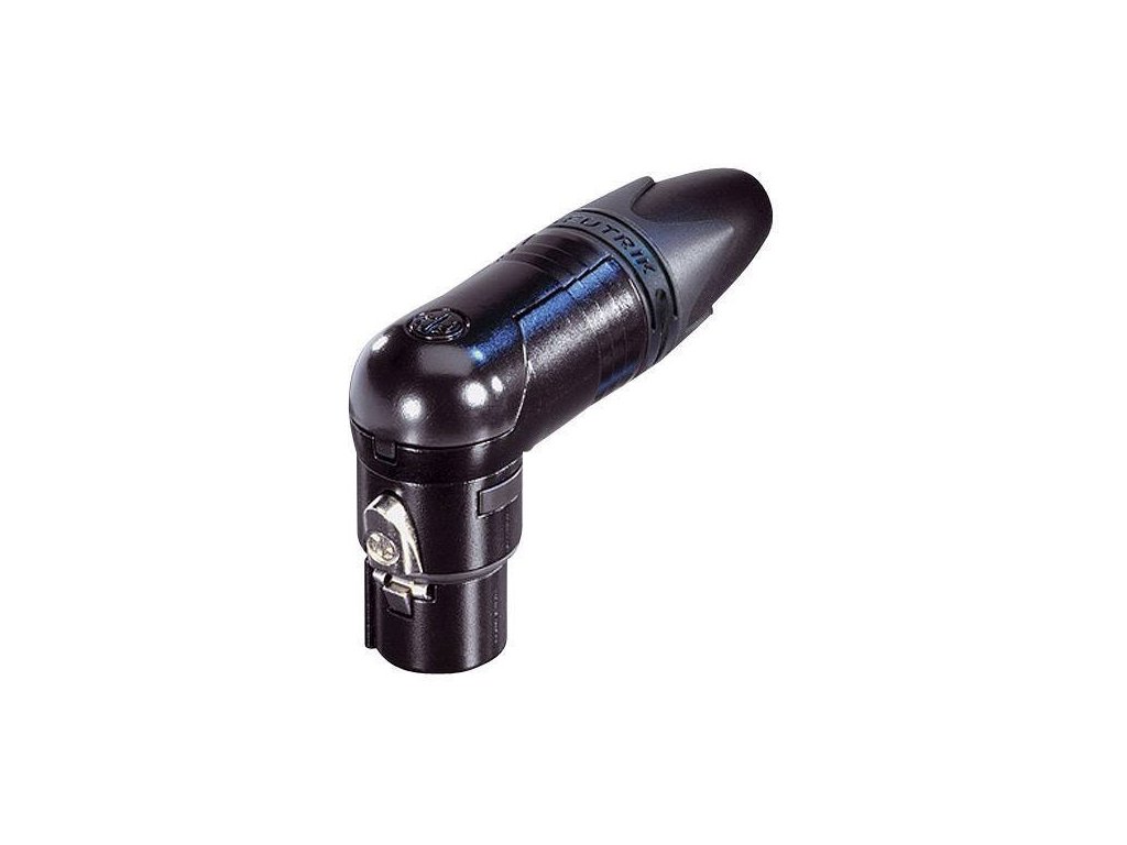 Kątowy 4-biegunowy konektor kablowy, żeński. Metalowa obudowa, pozłacane styki, kolor czarny.