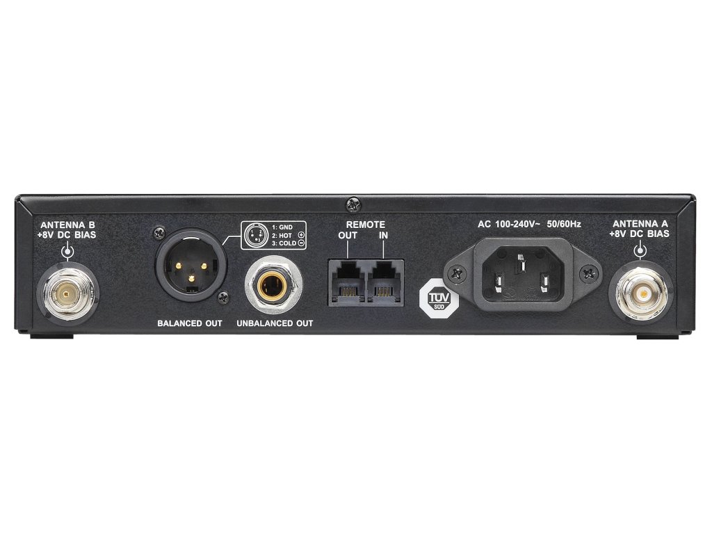 Przedni panel odbiornika zawiera regulację głośności wyjścia słuchawkowego do monitorowania poszczególnych kanałów odbiornika. Wszystkie inne ustawienia systemu, takie jak blokada szumów lub poziomy wyjścia odbiornika (0 dB, -10 dB, -20 dB, -30 dB), są dokonywane centralnie za pomocą zoptymalizowanego pokrętła jog. Kolorowy wyświetlacz LCD jest łatwo czytelny pod różnymi kątami i wyświetla ważne informacje o systemie, takie jak częstotliwość, grupa/kanał, nazwa użytkownika, siła pola, poziom dźwięku i pozostała pojemność baterii nadajnika. Funkcja blokady zapobiega niezamierzonej zmianie ustawień podczas użytkowania urządzenia.