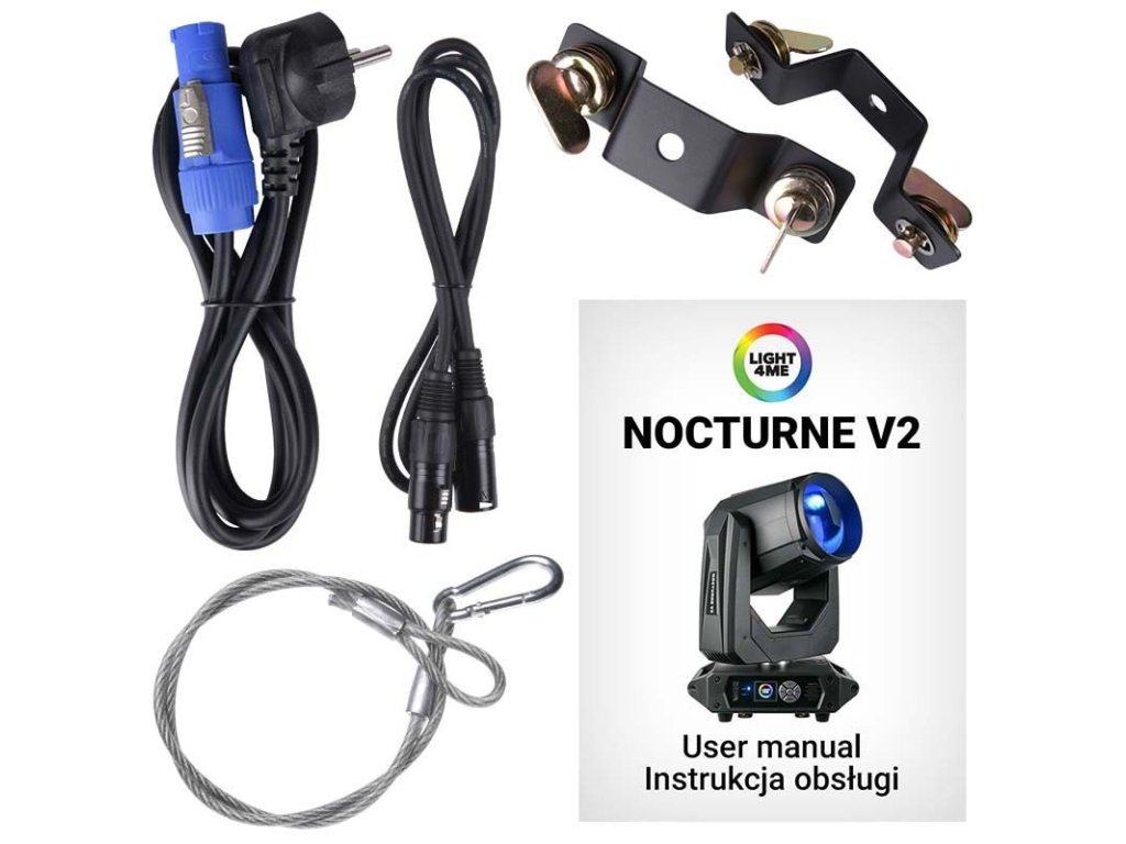 - Zawartość opakowania: Nocturne V2, uchwyty montażowe, linka zabezpieczająca, kabel zasilający, kabel DMX, instrukcja obsługi (EN/PL)