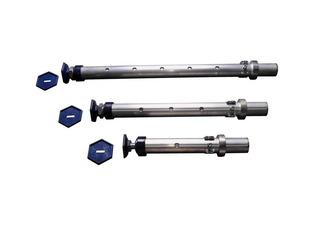 Aluminiowa rura śr. 48,3 mm, ścianka 4 mm, adapter z gwintem, pierścień obciążeniowy, wysuw co 5 cm, pozycjonowanie +/- 4 cm.