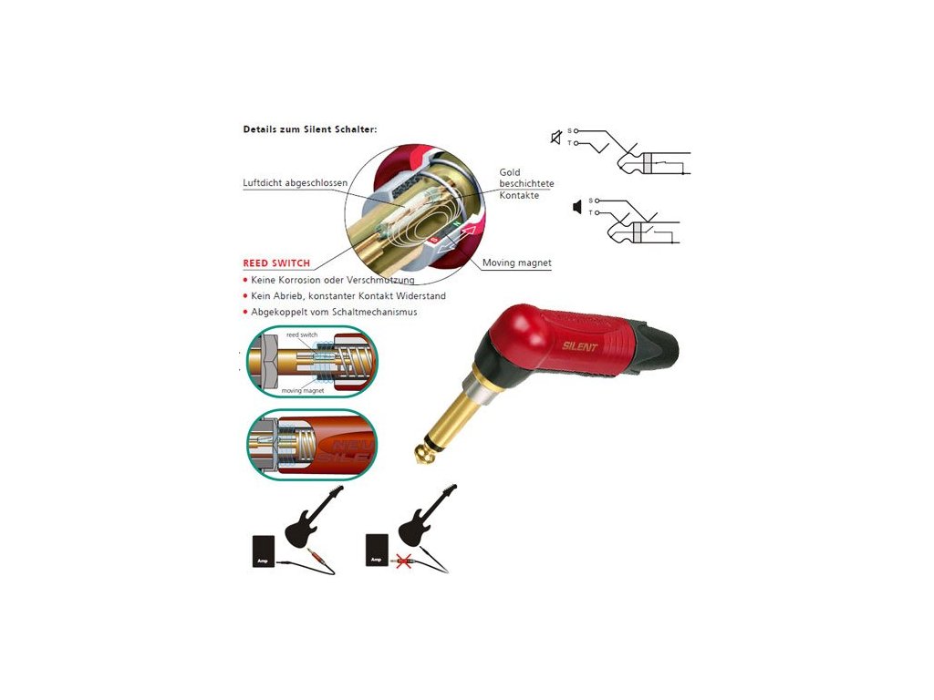 Seria złączy SilentPLUG to specjalnie zaprojektowana konstrukcja złączy przeznaczona do podłączania instrumentów muzycznych, takich jak gitary itp. Złącza te zawierają zintegrowany, cichy mikroprzełącznik kontaktronowy z technologią REED, który automatycznie zapobiega niepożądanemu efektowi piszczenia / trzaskania (HotSwapping) podczas podłączania instrumentu muzycznego do systemu dźwiękowego. Pozłacane styki zwiększają trwałość parametru kontaktu podczas użytkowania.