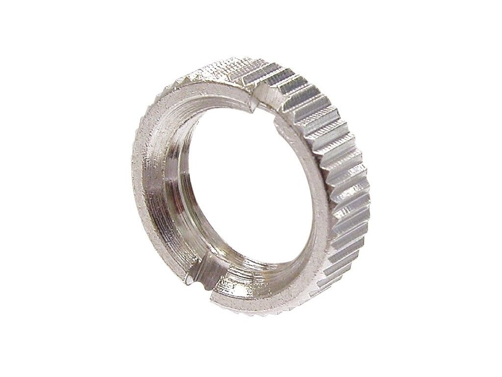 Nakrętka pierścieniowa, radełkowana. Mosiądz niklowany.