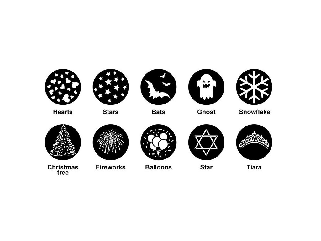 - Rozmiar gobo (metalowe): zewnętrzny 18,6 mm / wzór 12 mm / maksymalna grubość 5 mm