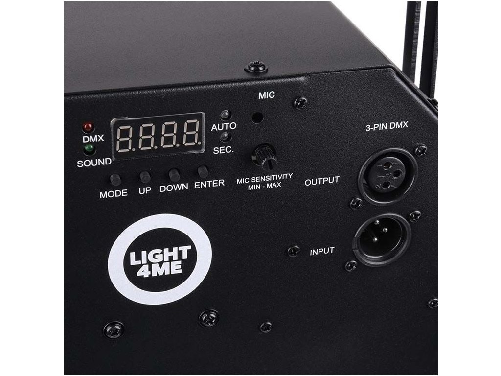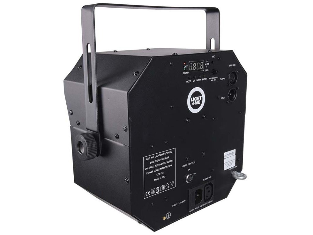 Light4Me Octaled to idealne oświetlenie dla mobilnych DJ-ów. Efekt posiada solidną metalową obudowę wyposażoną w uchwyt montażowy, który umożliwia dowolne umieszczenie multiefektu na statywach oświetleniowych, rampach i kratownicach. Na tylnej obudowie znajduje się panel sterowania składający się z cyfrowego wyświetlacza i 4 przycisków. Za jego pomocą możemy dokonywać zmian w ustawieniach menu i wybrać tryb pracy urządzenia:
