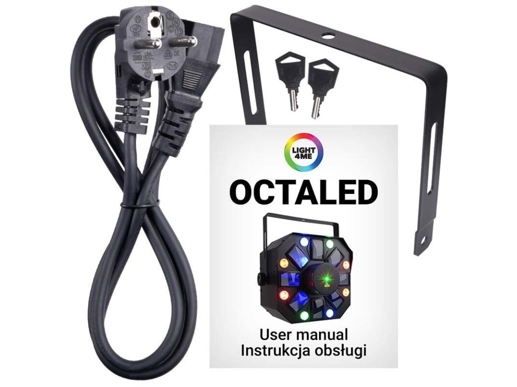 Light4Me Octaled to multiefekt, który ma zdolność tworzenia wielu kombinacji świetlnych bez konieczności używania dodatkowych urządzeń. Jest to możliwe dzięki trzem różnym źródłom światła: białym lampom stroboskopowym, kolorowym diodom LED pracującym w standardzie RGBWA oraz dwóm czerwonym i zielonym laserom. Dzięki tak różnorodnej palecie oświetlenia nigdy nie zabraknie Ci pomysłów na nowe otoczenie dla Twojej następnej imprezy.