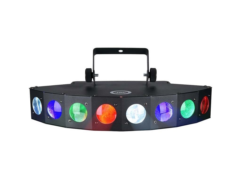 Reflektor sceniczny Light4Me Octobeam V2 jest wyposażony w 8 wydajnych 5-watowych diod LED pracujących ze światłem w palecie RGBW. Wytrzymała metalowa obudowa efektu jest wyposażona w uchwyt montażowy umożliwiający instalację światła na statywach, kratownicach scenicznych i rampach oświetleniowych. Z tyłu znajdują się wejścia i wyjścia XLR do sterowania urządzeniem za pomocą zewnętrznych sterowników DMX. Panel sterowania składa się z cyfrowego wyświetlacza i 4 przycisków. Za ich pomocą możemy wybrać jeden z predefiniowanych trybów pracy urządzenia: