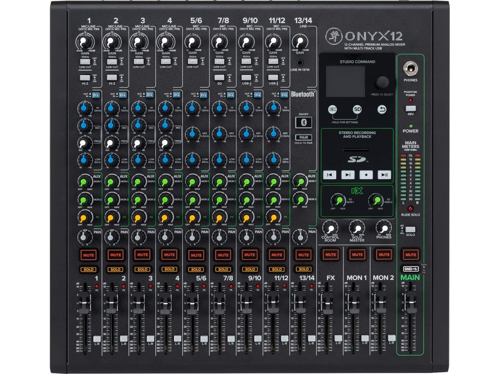 ONYX12 to dwunastokanałowy mikser z możliwością zapisu nagrania na kartę pamięci SD lub do oprogramowania DAW przez kabel USB. Każdy kanał dysponuje trzypasmowym equalizerem brytyjskiego typu inspirowanym dźwiękiem z lat 60. i 70. Mikser zapewnia ultra czysty przekaz dźwięku z zerową latencją i zniekształceniami.