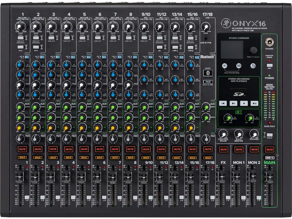 ONYX16 to szesnastokanałowy mikser z możliwością zapisu nagrania na kartę pamięci SD lub do oprogramowania DAW przez kabel USB. Każdy kanał dysponuje trzypasmowym equalizerem brytyjskiego typu inspirowanym dźwiękiem z lat 60. i 70. Mikser zapewnia ultra czysty przekaz dźwięku z zerową latencją i zniekształceniami.