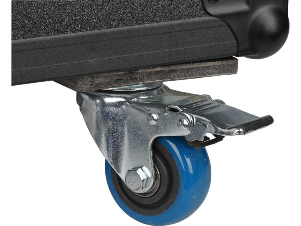Cztery obrotowe kółka, z których dwa są wyposażone w hamulec, sprawiają, że walizka jest niezwykle zwrotna i stabilna. Idealnie sprawdzi się zarówno podczas transportu w furgonetce, jak i podczas montażu sprzętu na scenie lub w klubie.