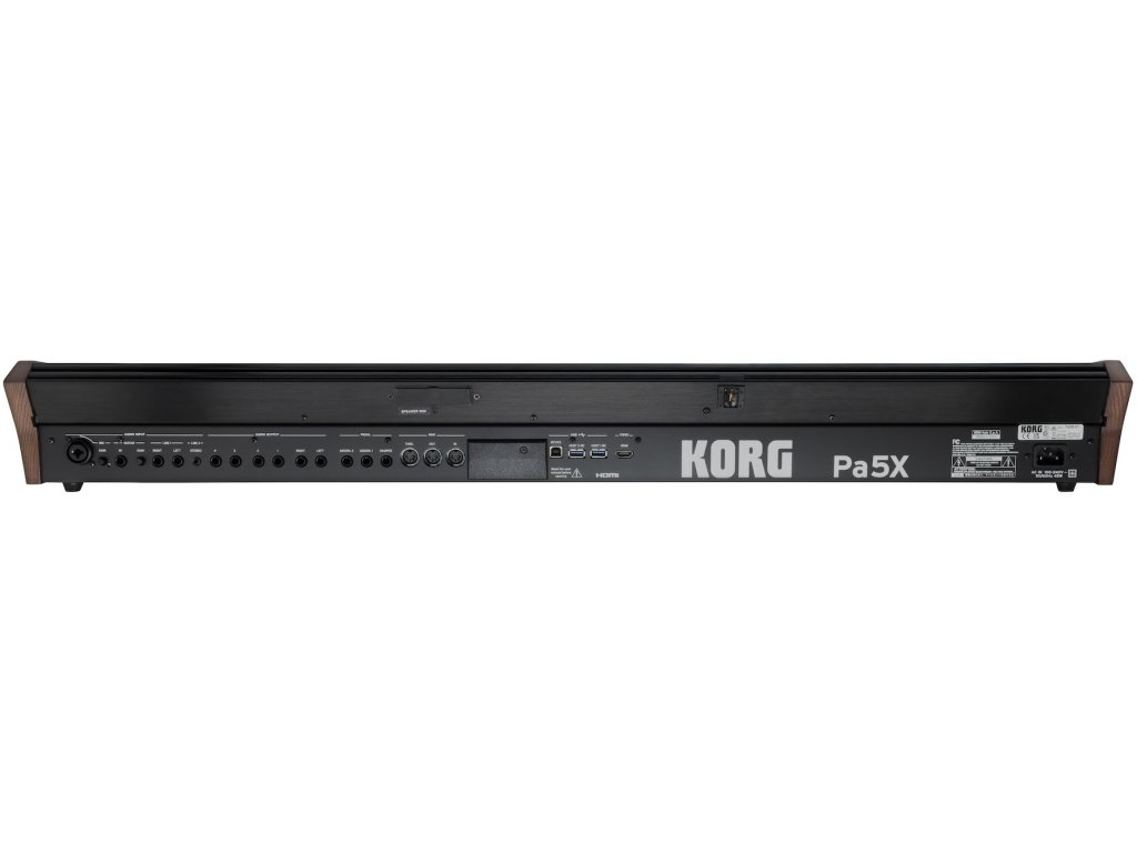 Do oddzielnych wejść audio Pa5X można jednocześnie podłączyć mikrofon i gitarę. KORG ma również bogate doświadczenie w technologii harmonizacji wokali i przetwarzania efektów gitarowych, przy czym każde z tych wejść jest wyposażone w specjalne efekty. Całkowicie niezależne wejście gitarowe ma nawet własne sterowanie sygnałem wejściowym. Efekty gitarowe obejmują pedały vintage i symulatory wzmacniaczy, co dodatkowo poprawia brzmienie i wydajność gitary. Dostępnych jest wiele predefiniowanych presetów gitarowych, do 4 efektów insertowych, a także można łatwo tworzyć i zapisywać własne presety efektowe. Pa5X oferuje wiele połączeń dźwiękowych, sterujących i pamięci masowej. MIDI i USB można użyć do kontrolerów lub dysków zewnętrznych, HDMI do zewnętrznego wyświetlacza, złącza audio XLR i mini do innych klawiatur, mikrofonów pojemnościowych i dynamicznych, gitar i basów, telefonów komórkowych i tabletów lub do podłączenia instrumentu do aktywnych kolumn głośnikowych lub systemów PA przez symetryczne wyjścia. Do oddzielnej obsługi dźwięków dostępne są cztery niezależne wyjścia liniowe. Trzy wejścia pedałowe umożliwiają podłączenie preferowanego pedału damper (z obsługą half-pedalingu), przełącznika nożnego, pedału głośności i ekspresji. W zestawie znajduje się kabel zasilający i statyw na nuty.