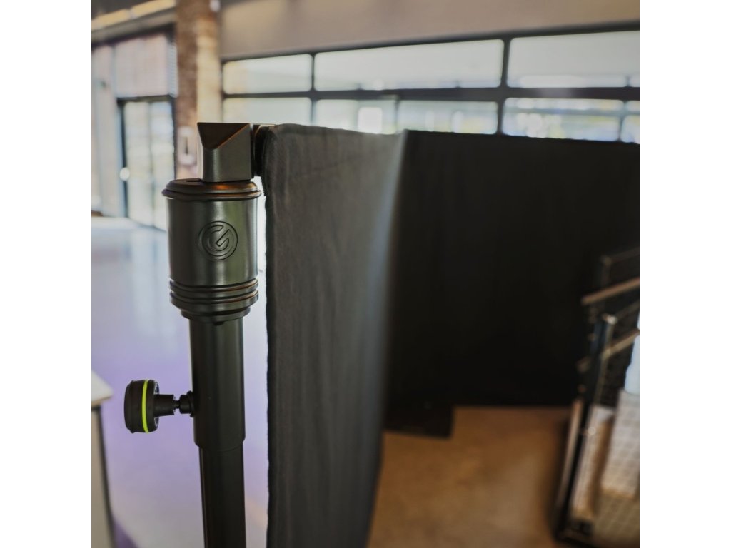 System kurtyn Gravity® Pipe and Drape oferuje innowacyjne rozwiązania dla muzyków, zespołów, techników eventowych, teatrów, wystawców i konstruktorów stoisk. Umożliwia szybkie i efektywne strukturyzowanie pomieszczeń, podział przestrzeni, zawieszenie na ścianie lub wyznaczenie przejścia. Dzięki zastosowaniu zestawu PAD SET 2, który składa się z adaptera PAD A, teleskopowego drążka PAD T i kurtyny PAD C B 1 Molton, standardowe statywy głośnikowe lub oświetleniowe z drążkiem 35 mm można bez problemu przekształcić w kompleksowe zestawy pipe and drape przy minimalnym wysiłku. Wystarczy umieścić adapter PAD A na statywie i przymocować teleskopowy drążek, wsuwając śruby mocujące w otwory adaptera. Następnie zasłonę Molton można bez wysiłku przymocować do poprzeczki.