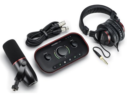 Zestaw studyjny: Karta dźwiękowa, mikrofon pojemnościowy, słuchawki studyjne.