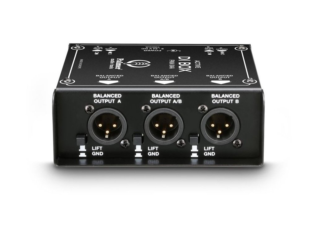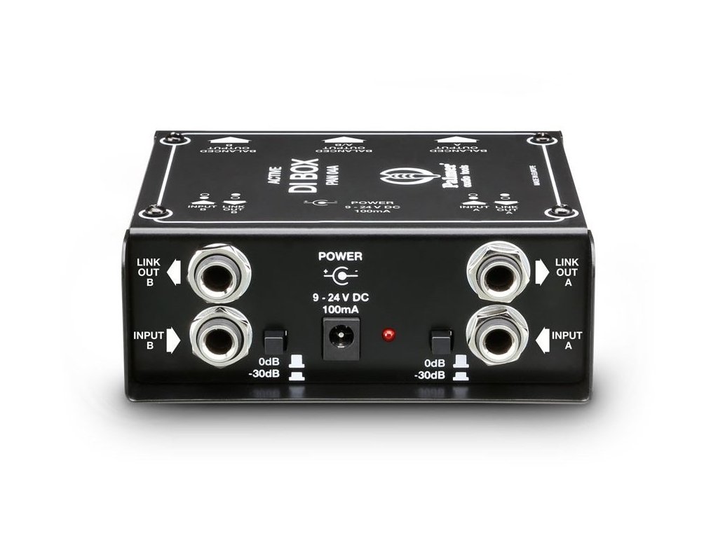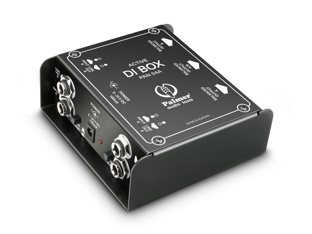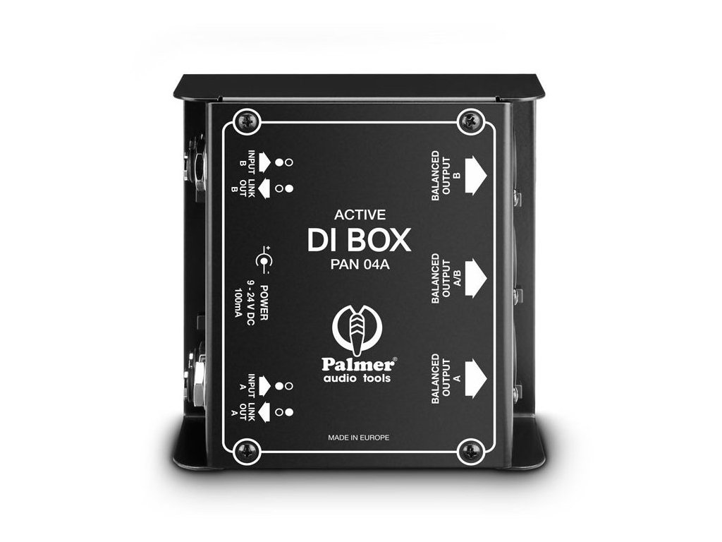 Palmer PAN04A to dwukanałowy DI box do przesyłania niesymetrycznych sygnałów o wysokiej impedancji z instrumentów elektrycznych do wejść mikrofonowych konsolety mikserskiej. Zapewnia zbalansowany transformatorowo sygnał o niskiej impedancji na wyjściach i eliminuje szumy i zakłócenia spowodowane pętlami uziemienia. Aktywny obwód pozostawia nienaruszoną odpowiedź częstotliwościową i osiąga wysoki zakres dynamiczny. Oprócz bezpośrednich wyjść 6,35 mm i przełączanego tłumika wejściowego -30 dB, DI box posiada monofoniczne wyjście, które sumuje oba kanały. PAN04A charakteryzuje się wyjątkowo solidną konstrukcją i nadaje się zarówno do zastosowań scenicznych, jak i studyjnych. Może być zasilany zasilaczami sieciowymi 9 do 24 V DC lub z zasilaniem fantomowym po podłączeniu dwóch wyjść do konsolety mikserskiej.