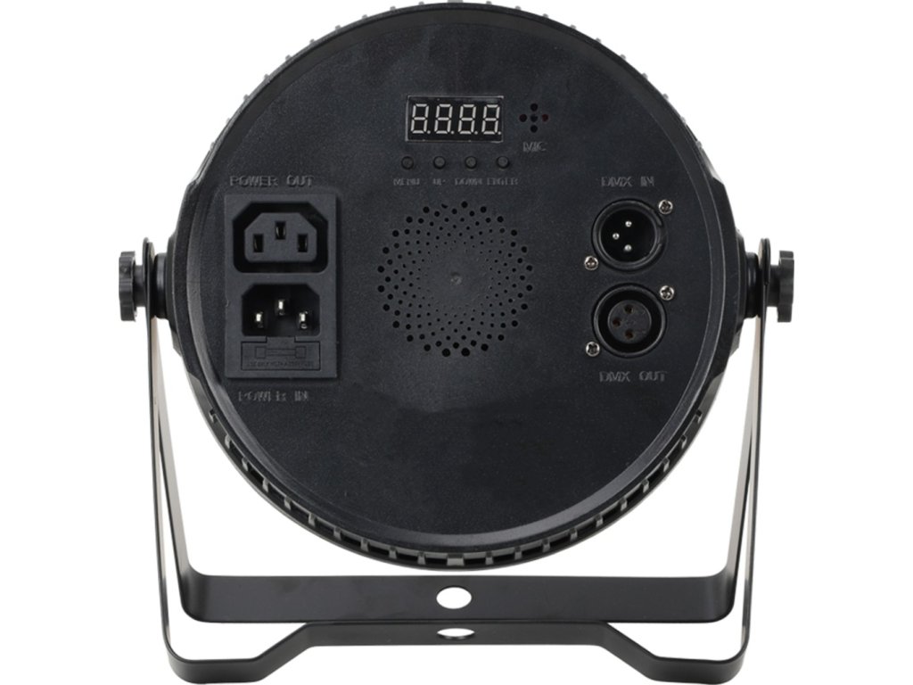 Konstrukcja wykonana z wytrzymałego tworzywa ABS oraz uchwyt montażowy z malowanego proszkowo żelaza gwarantują solidność, a jednocześnie niską wagę – zaledwie 1,05 kg. Reflektor wyposażony jest w aktywny system chłodzenia, który zapewnia stabilną pracę nawet podczas długich występów.
