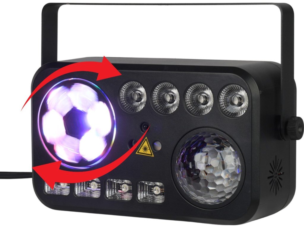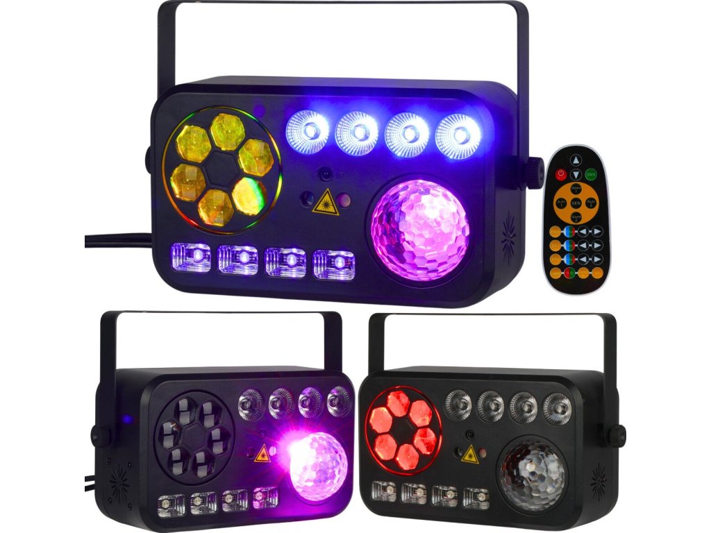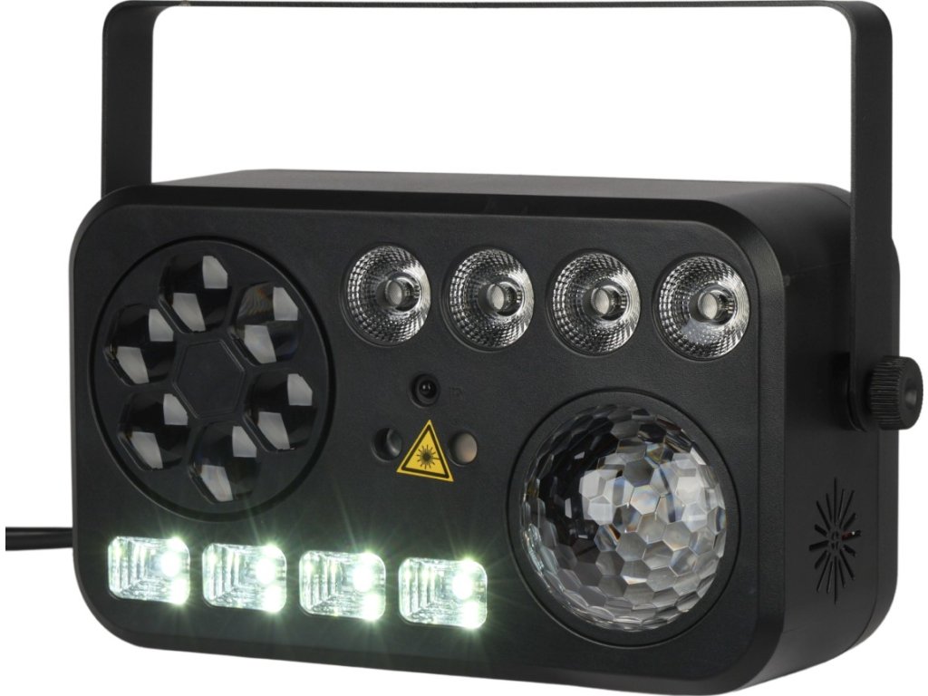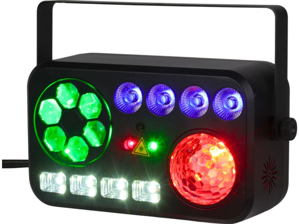 Light4Me Party V to multiefekt świetlny 6w1, który zapewni niesamowitą atmosferę na każdej imprezie. Dzięki połączeniu efektów Bee Eye, białego stroboskopu, światła UV, Water Wave, reflektorów PAR oraz lasera (czerwonego i zielonego), możesz stworzyć dynamiczne i barwne widowisko świetlne. Light4Me Party V idealnie sprawdzi się w klubach, na scenach, jak i podczas domowych przyjęć. Dzięki wielu prostym opcjom sterowania: DMX, pilotowi na podczerwień, trybowi automatycznemu i manualnemu, masz pełną kontrolę nad efektami.