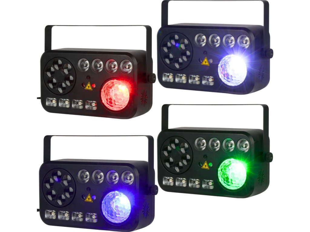 - Źródło światła: efekt Bee Eye: 6x8W RGBW LED 4w1, efekt stroboskopu białego/UV: 4x3W W+UV LED 2w1, efekt Water Wave: 10W RGBW LED 4w1, efekt PAR: 4x4W RGBW LED 4w1, laser czerwony: 120 mW, laser zielony: 30 mW