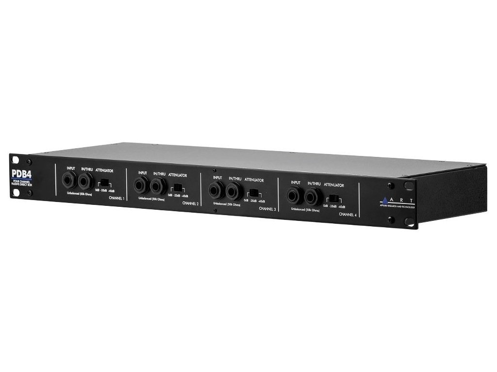 ART PDB4 to wysokiej jakości 4-kanałowy pasywny direct box w obudowie rack 1U, który umożliwia podłączenie sygnału liniowego, instrumentalnego lub głośnikowego do miksera lub innego urządzenia z symetrycznym wejściem. Sygnał z wysokoimpedancyjnego gniazda 1/4" Jack jest przekształcany przez transformator na symetryczny sygnał niskoimpedancyjny. PDB łączy w sobie szeroki zakres częstotliwości i zdolność przetwarzania wzmocnionego sygnału, dzięki czemu oferuje czysty i transparentny dźwięk, co docenisz szczególnie w trudnych warunkach, np. podczas występów na żywo. Dodatkowo PDB4 oferuje funkcję GROUND LIFT oddzielnie dla każdego kanału. Wejście każdego kanału jest wyposażone w parę złączy ¼” jack (INPUT i IN/THRU) oraz trójpozycyjny przełącznik czułości wejściowej ATTENUATOR (0dB, -20dB, -40dB). Na wyjściu każdego kanału znajduje się złącze XLR.