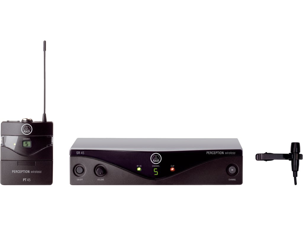 Częścią zestawu AKG Perception WMS45 Wireless Presenter Set jest odbiornik AKG SR45, bodypack AKG PT45 i mikrofon krawatowy AKG CK99. Odbiornik ma na swoim podwoziu minimum elementów sterujących, mimo to ustawianie parametrów nie jest w żaden sposób ograniczone. Do sterowania służy potencjometr Volume, przycisk Channel do przełączania kanałów, wyświetlacz LED pokazujący wybrany kanał, wskaźniki LED sygnału i clippingu, wyłącznik i trymer do ustawiania squelch. Wyjścia są wyposażone w złącza XLR i ¼“ Jack. Bodypack PT45 jest najmniejszym i najlżejszym nadajnikiem w swojej klasie, a ponadto jest kompatybilny z miniaturowymi mikrofonami AKG MicroMics, które umożliwiają wysokiej jakości nagłośnienie wszystkich popularnych instrumentów. PT45 jest wyposażony w wyświetlacz, wskaźnik LED stanu baterii i wyłącznik, pod pokrywą baterii znajduje się przełącznik kanałów i trymer do ustawiania poziomu wejściowego. Bodypack jest zasilany jedną baterią AA, która zapewnia żywotność do 10 godzin. Dołączony mikrofon krawatowy lavalier zapewnia naturalną reprodukcję głosu z podkreślonym pasmem powyżej 10kHz, co zwiększa zrozumiałość mowy. Kardioidalna charakterystyka kierunkowa i zmniejszona czułość na niskie częstotliwości gwarantują bardzo dobrą odporność na zakłócenia wszelkiego rodzaju.