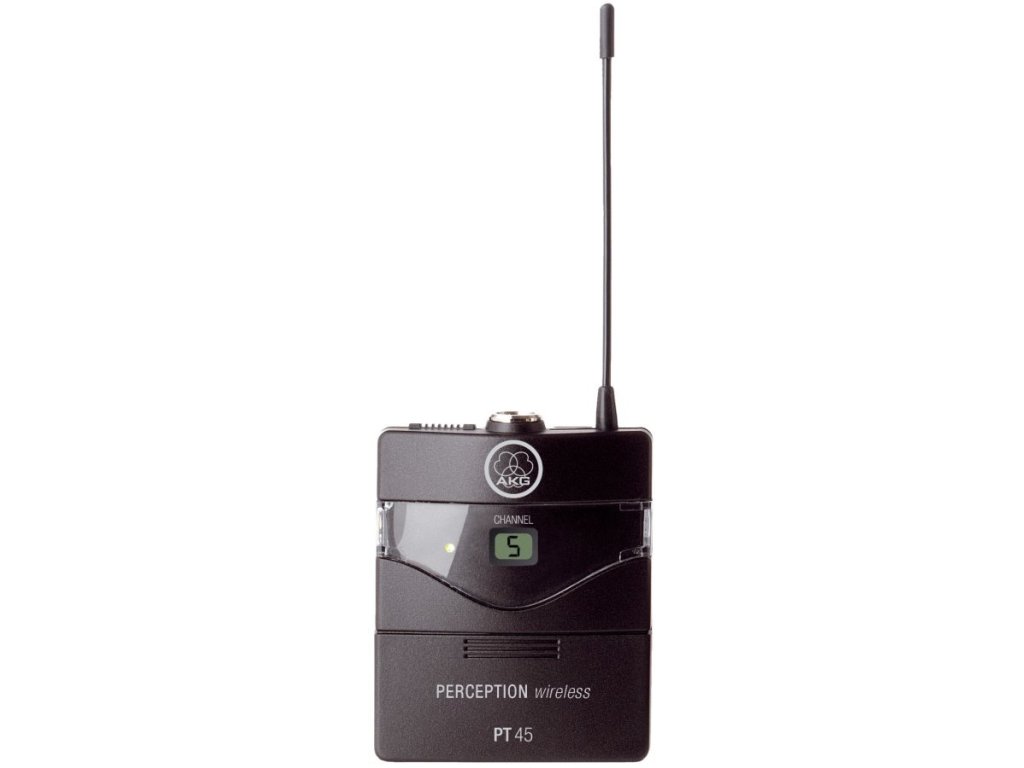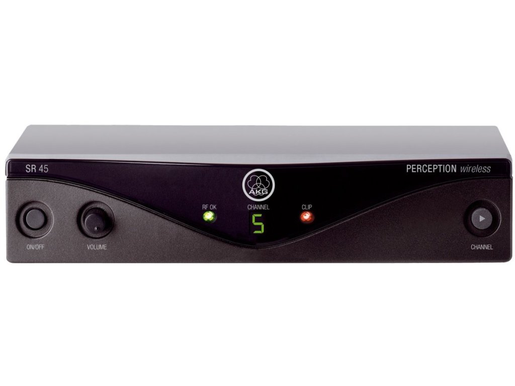Częścią zestawu AKG Perception WMS45 Wireless Presenter Set jest odbiornik AKG SR45, bodypack AKG PT45 i mikrofon krawatowy AKG CK99. Odbiornik ma na swoim podwoziu minimum elementów sterujących, mimo to ustawianie parametrów nie jest w żaden sposób ograniczone. Do sterowania służy potencjometr Volume, przycisk Channel do przełączania kanałów, wyświetlacz LED pokazujący wybrany kanał, wskaźniki LED sygnału i clippingu, wyłącznik i trymer do ustawiania squelch. Wyjścia są wyposażone w złącza XLR i ¼“ Jack. BodypackPT45 jest najmniejszym i najlżejszym nadajnikiem w swojej klasie, a ponadto jest kompatybilny z miniaturowymi mikrofonami AKG MicroMics, które umożliwiają wysokiej jakości nagłośnienie wszystkich popularnych instrumentów. PT45 jest wyposażony w wyświetlacz, wskaźnik LED stanu baterii i wyłącznik, pod pokrywą baterii znajduje się przełącznik kanałów i trymer do ustawiania poziomu wejściowego. Bodypack jest zasilany jedną baterią AA, która zapewnia żywotność do 10 godzin. Dołączony mikrofon krawatowy lavalier zapewnia naturalną reprodukcję głosu z podkreślonym pasmem powyżej 10kHz, co zwiększa zrozumiałość mowy. Kardioidalna charakterystyka kierunkowa i zmniejszona czułość na niskie częstotliwości gwarantują bardzo dobrą odporność na zakłócenia wszelkiego rodzaju.