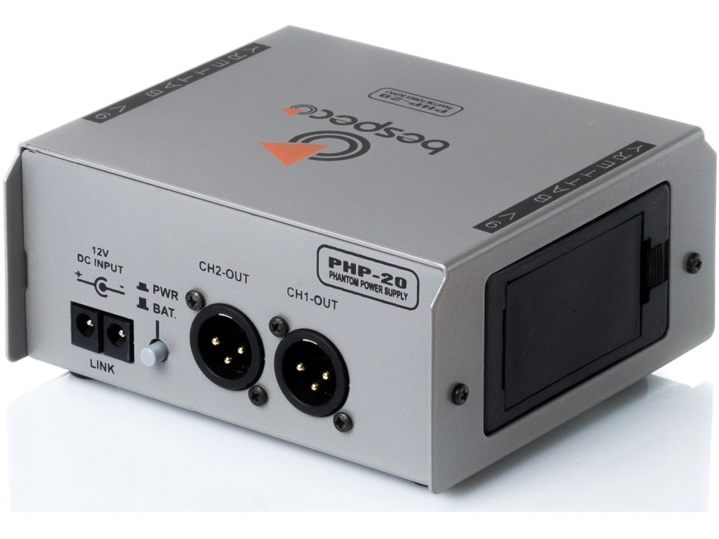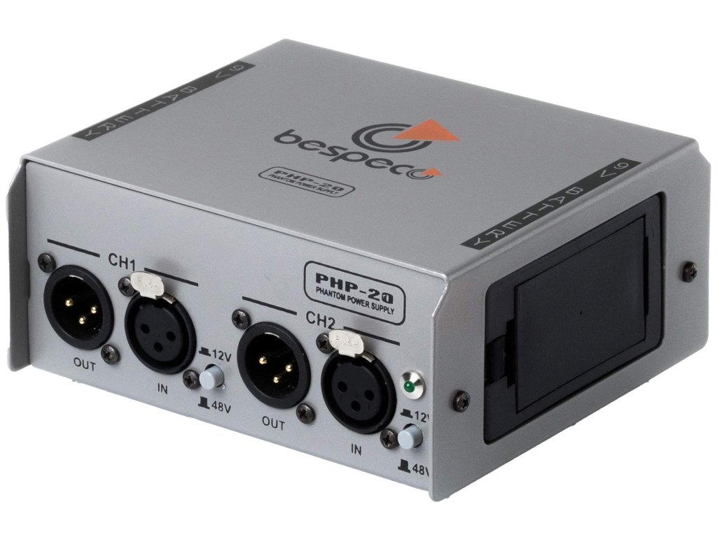 Bespeco PHP20 to dwukanałowe zasilanie phantom mikrofonów pojemnościowych lub innych urządzeń. Posiada przełącznik napięcia od 12 do 48 V. Można go zasilać dwiema bateriami dziewięciowoltowymi lub zasilaczem 12 V (nie jest dołączony do zestawu).