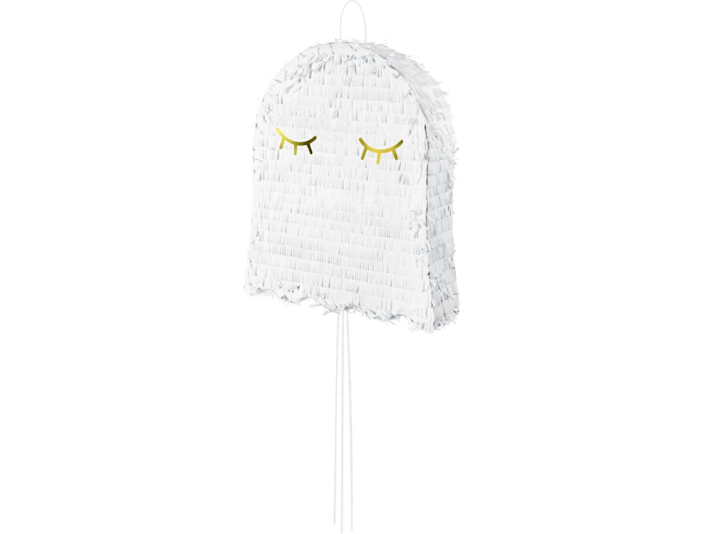 Pinata w kształcie ducha w kolorze białym ze złotymi oczami, do napełnienia smakołykami, rozmiar ok. 41,5 x 50 x 10 cm.Parametry dodatkowe