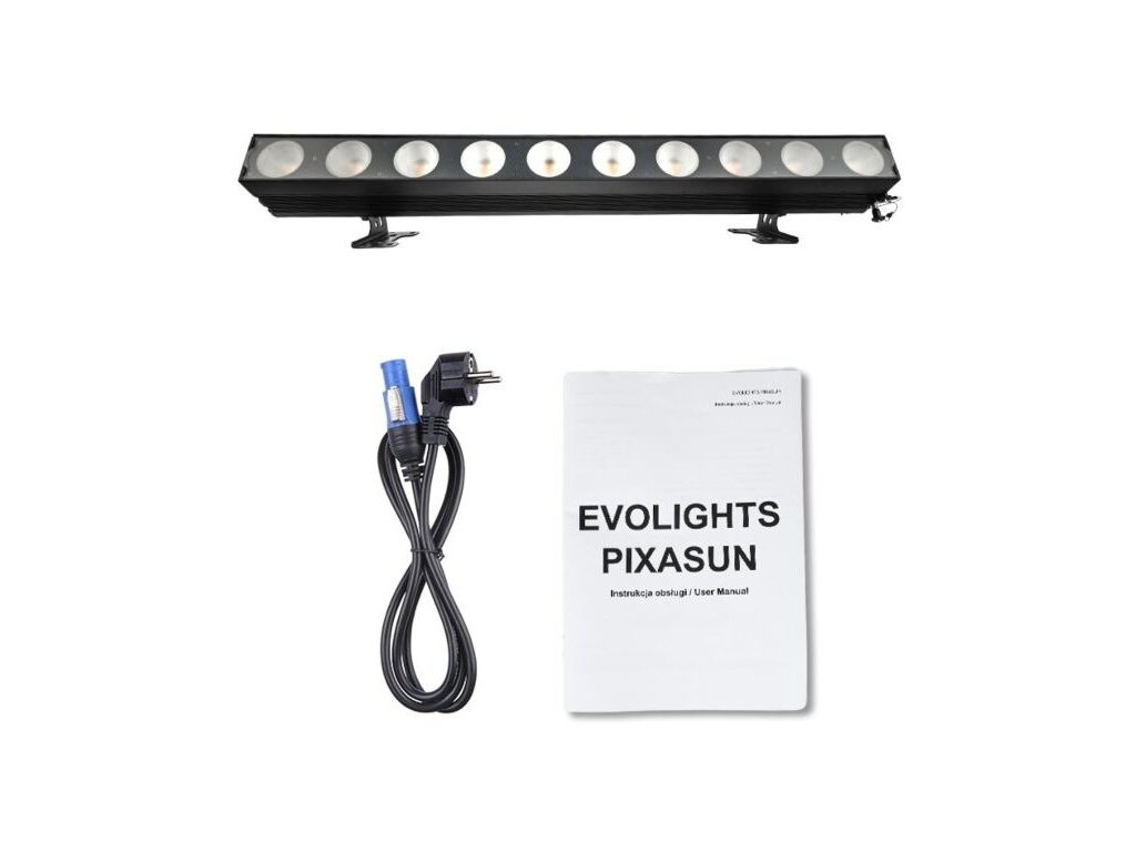 EVOLIGHTS PIXASUN to innowacyjna listwa oświetleniowa, która idealnie nadaje się między innymi do teatrów, klubów, dyskotek, na koncerty, imprezy firmowe, wesela i bankiety. Listwa LED wyposażona jest w 10 diod LED o mocy 50 W każda, pracujących w palecie barw WW+A (ciepła biel, bursztynowa), co pozwala na niemal nieograniczone możliwości tworzenia spektakularnych efektów wizualnych. Dodatkowo funkcja Pixel Control umożliwia indywidualne sterowanie każdą diodą LED, co wraz z 9 trybami kanałów DMX pozwala na personalizację stworzonych już efektów świetlnych. Dzięki wąskiemu kątowi świecenia listwa zapewnia precyzyjne oświetlenie. Temperatura barwowa 1800-2800 K tworzy ciepłe światło, które jest przyjemne dla oka. EVOLIGHTS PIXASUN z pewnością docenią oświetleniowcy sceniczni, organizatorzy imprez i przyjęć, DJ-e i inni.