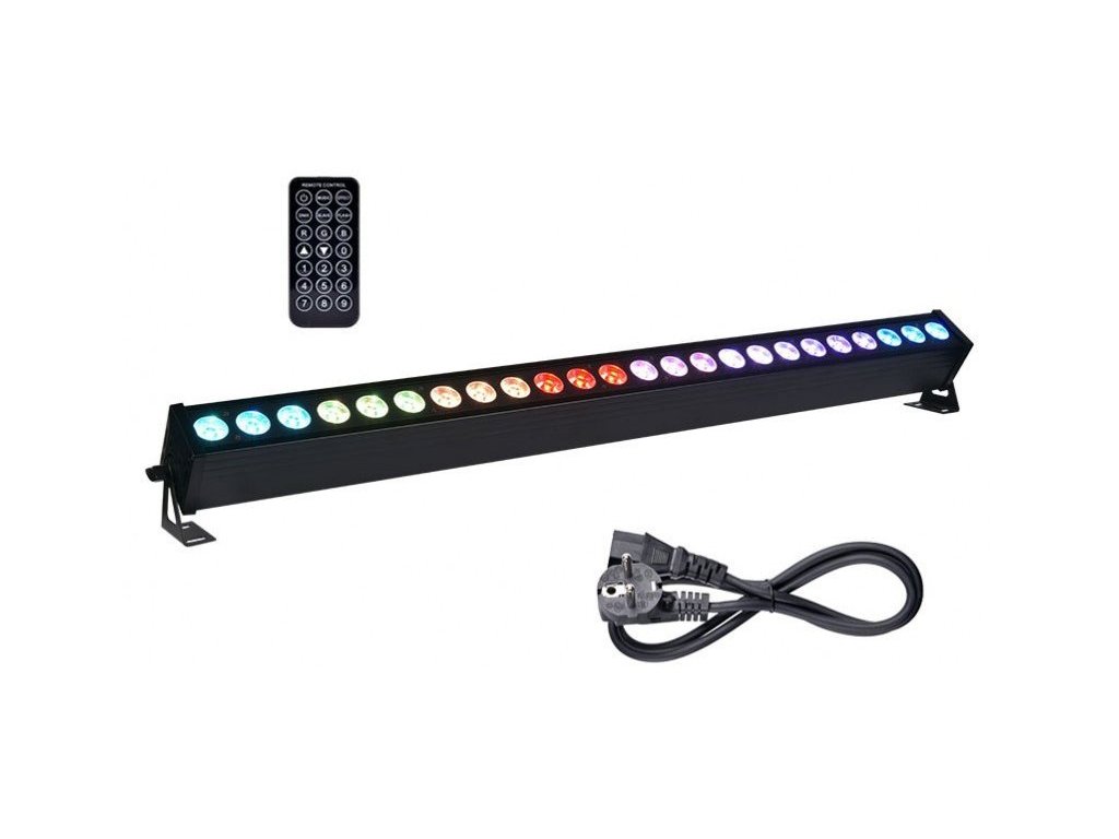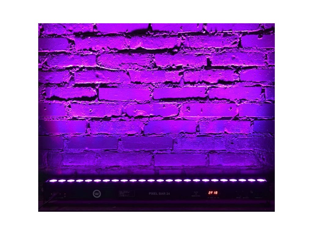 LIGHT4ME PIXEL BAR 24x3 MKIII IR to lekki pas świetlny, którym można sterować bezprzewodowym pilotem na podczerwień zamkniętym w solidnej metalowej obudowie. Źródło światła składa się z 24 mocnych diod LED 3W pracujących w palecie barw RGB (czerwona, zielona, niebieska), a zastosowana optyka umożliwia emisję pojedynczej wiązki światła pod kątem 25°.