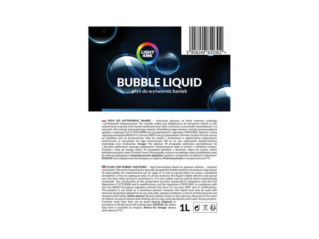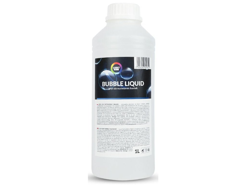 LIGHT4ME Bubble liquid 1L to profesjonalny i bardzo skuteczny płyn do wytwornic baniek mydlanych. Płyn jest bezwonny i stworzony na bazie mieszanki czystej wody i niejonowych środków powierzchniowo czynnych. Płyn jest szeroko stosowany, zwłaszcza w przemyśle rozrywkowym. Można go używać do tworzenia efektów scenicznych podczas przedstawień i różnego rodzaju imprez. Bańki z niego utworzone mają zwartą strukturę, są lekkie i długo utrzymują się w powietrzu. Płyn do wytwornic baniek mydlanych Light4Me jest szczególnie odpowiedni dla animatorów gier i zabaw dla dzieci, na karnawały, a także dla firm organizujących różnego rodzaju imprezy.