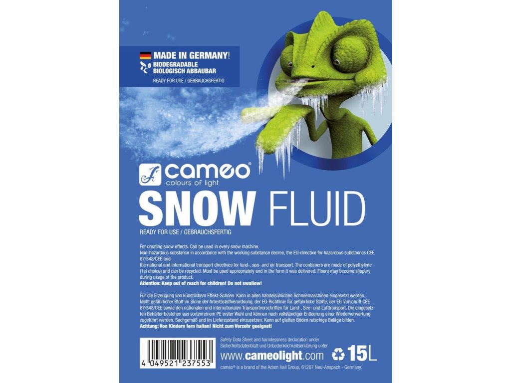Cameo Snow-Fluid został stworzony specjalnie dla profesjonalnych wytwornic piany i tworzy solidne białe płatki piany o wysokim współczynniku odbicia, które rozpuszczają się bez pozostawiania śladów. Jest natychmiast gotowy do użycia, bezwonny i biodegradowalny. Cameo Snow Fluid jest całkowicie nieszkodliwy i nietoksyczny