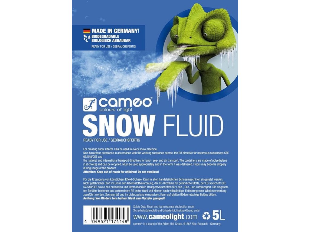 Cameo Snow-Fluid został stworzony specjalnie dla profesjonalnych wytwornic piany i tworzy solidne białe płatki piany o wysokim współczynniku odbicia, które rozpuszczają się bez pozostawiania śladów. Jest natychmiast gotowy do użycia, bezwonny i biodegradowalny. Cameo Snow Fluid jest całkowicie nieszkodliwy i nietoksyczny