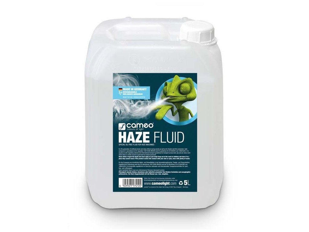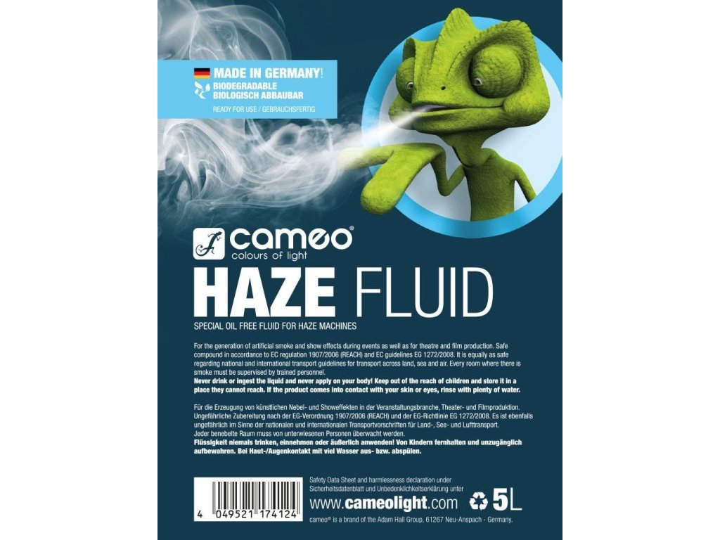 Płyn Cameo Haze Fluid na bazie wody został specjalnie opracowany do wytwornic mgły i tworzy bardzo delikatną mgłę o długim czasie utrzymywania się i wysokim współczynniku odbicia. W 100% bezolejowy płyn jest bezwonny i idealnie nadaje się do wszystkich zastosowań scenicznych, klubów nocnych, filmu i telewizji. Jakość Cameo Haze-Fluid jest stale monitorowana podczas produkcji w Niemczech. Jest biodegradowalny i całkowicie nieszkodliwy.