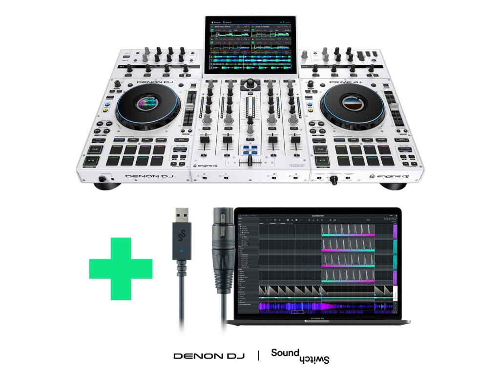 Korzystny zestaw profesjonalnego, samodzielnego kontrolera DJ Denon DJ Prime 4+ Special White Edition oraz interfejsu Soundswitch DMX MICRO.