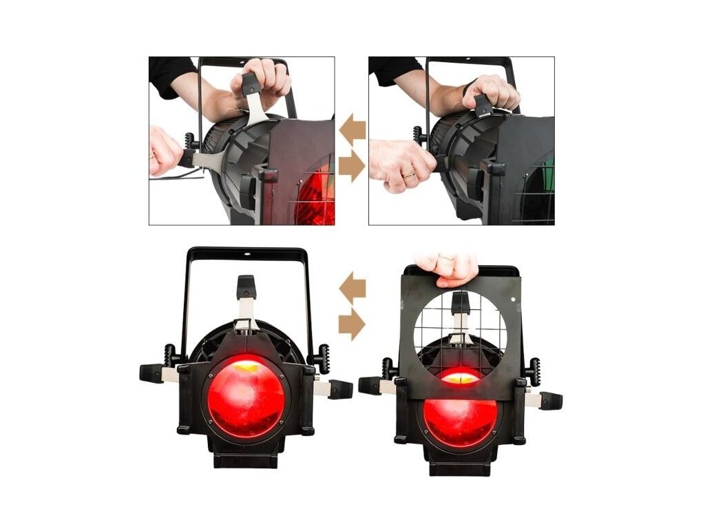 Dzięki liniowemu ściemniaczowi o pełnym zakresie i 4 krzywym - liniowej, Square Law, Inverse Square Law i S-Curve - oraz 2 trybom pracy (LED i halogen) użytkownik ma pełną kontrolę nad jasnością i intensywnością światła. Zakres efektów reflektora wzbogaca również funkcja stroboskopu z regulowaną prędkością. Dodatkowo, noże ramowe umożliwiają precyzyjne przycięcie światła do pożądanego kształtu, co jest niezbędne w teatrze lub podczas koncertów rockowych. Ten reflektor sprawdzi się zarówno na dużych scenach, jak i w mniejszych, średniej wielkości przestrzeniach.