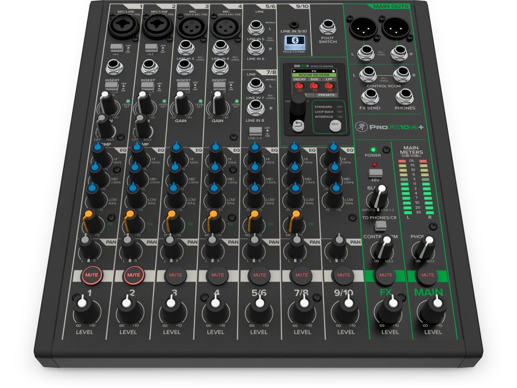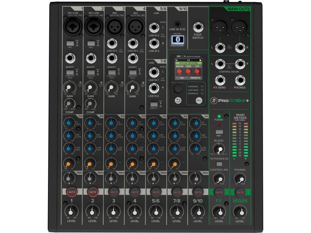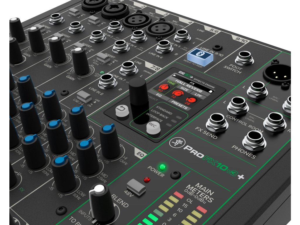 Analogowy mikser ProFX10v3+ od renomowanego producenta Mackie kontynuuje wyznaczony trend i elastycznie dostosowuje się do aktualnych trendów i wymagań. Podobnie jak starsza wersja bez plusa w nazwie, oferuje dziesięć kanałów, trzypasmowy equalizer, kompresor, przedwzmacniacze Onyx z 60 dB gainu i praktycznie zerowym szumem dla maksymalnie czystego przesyłu sygnału dźwiękowego, procesor efektów GigFX z 24 efektami (od reverbów po efekty delay) i nagrywanie w doskonałej jakości dzięki interfejsowi USB 192 kHz/24 bit 2x 4. Nowością jest kanał wyposażony w Bluetooth do wysyłania i odbierania dźwięku z urządzeń takich jak smartfon lub tablet, który oferuje podcasterom prosty sposób na odbieranie połączeń przychodzących. Kolejne rozszerzenie funkcji stanowią trzy tryby nagrywania USB - w trybie Standard nagrywasz cały miks głównych kanałów wraz z efektami i EQ do PC/DAW, w trybie Loopback natomiast nagrywasz audio z PC do miksera, co jest idealne podczas streamowania gier lub grania/improwizowania do podkładów, a w trybie Interface nagrywasz do PC/DAW czysty sygnał z głównych kanałów 1 i 2 bez domieszek w postaci efektów i EQ. Podobnie jak w starszej wersji, dostępne są cztery kanały z wejściami mikrofonowymi (2x combo XLR/1/4", 2x XLR), wejścia liniowe (2 x 1/4", 4 x 1/4", w tym 2x stereo, 1 x 1/8" stereo), cztery inserty, 1x FX Send, wyjście słuchawkowe, wejście dla footswitcha oraz symetryczne i niesymetryczne wyjścia (2 x XLR, 2 x 1/4" L/R, 2 x 1/4" control room).