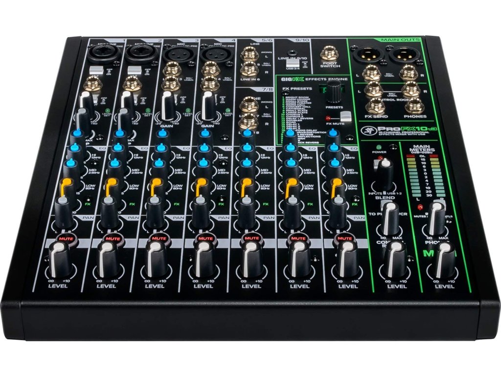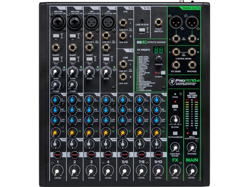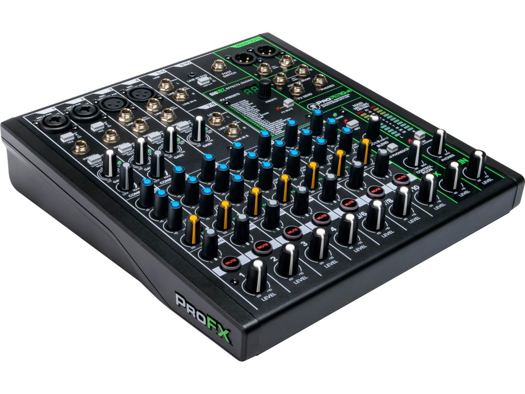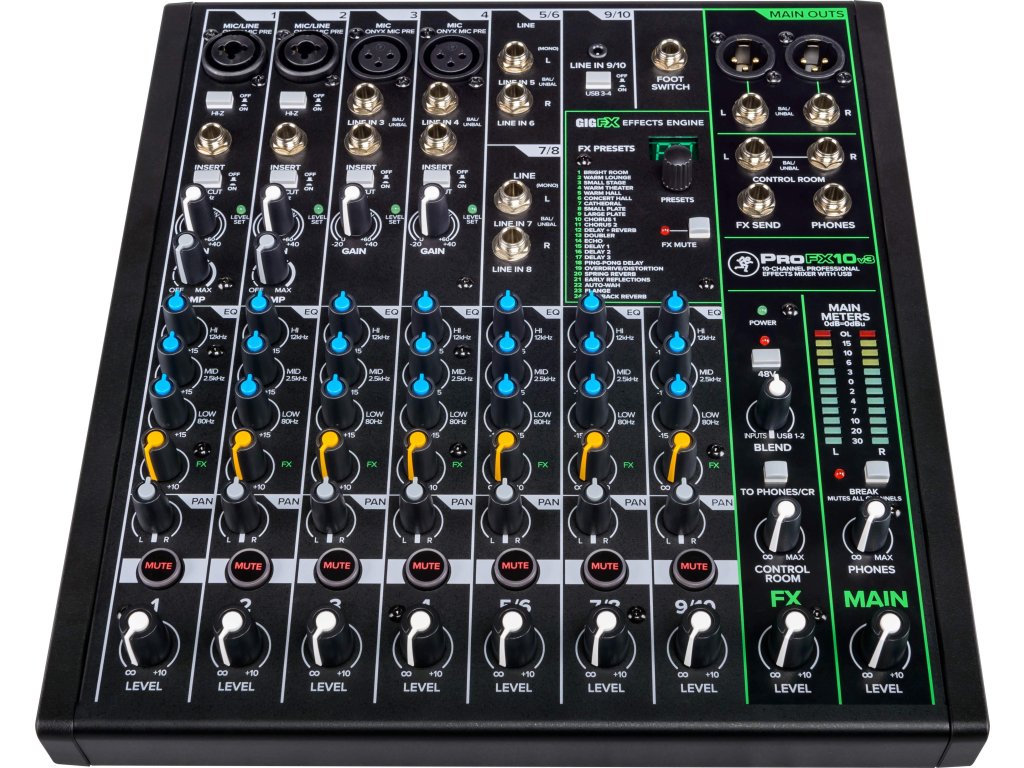 Konkretnie ProFX10v3 to dziesięciokanałowy mikser z czterema przedwzmacniaczami Onyx i silnikiem dźwiękowym GigFX. Dźwięk można regulować za pomocą intuicyjnych elementów sterujących i trzypasmowego korektora na każdym kanale, oprócz dwóch wejść Kombi XLR/Jack, mikser posiada również stopień Hi-Z do bezpośredniego podłączenia gitary/gitary basowej, dwa wejścia XLR, dwa stereofoniczne wejścia Jack i wejście liniowe Line IN dla odtwarzacza muzycznego lub urządzenia mobilnego. Ponadto znajduje się tutaj wyjście na monitory, wyjście główne, wyjście słuchawkowe i wejście na przełącznik nożny.