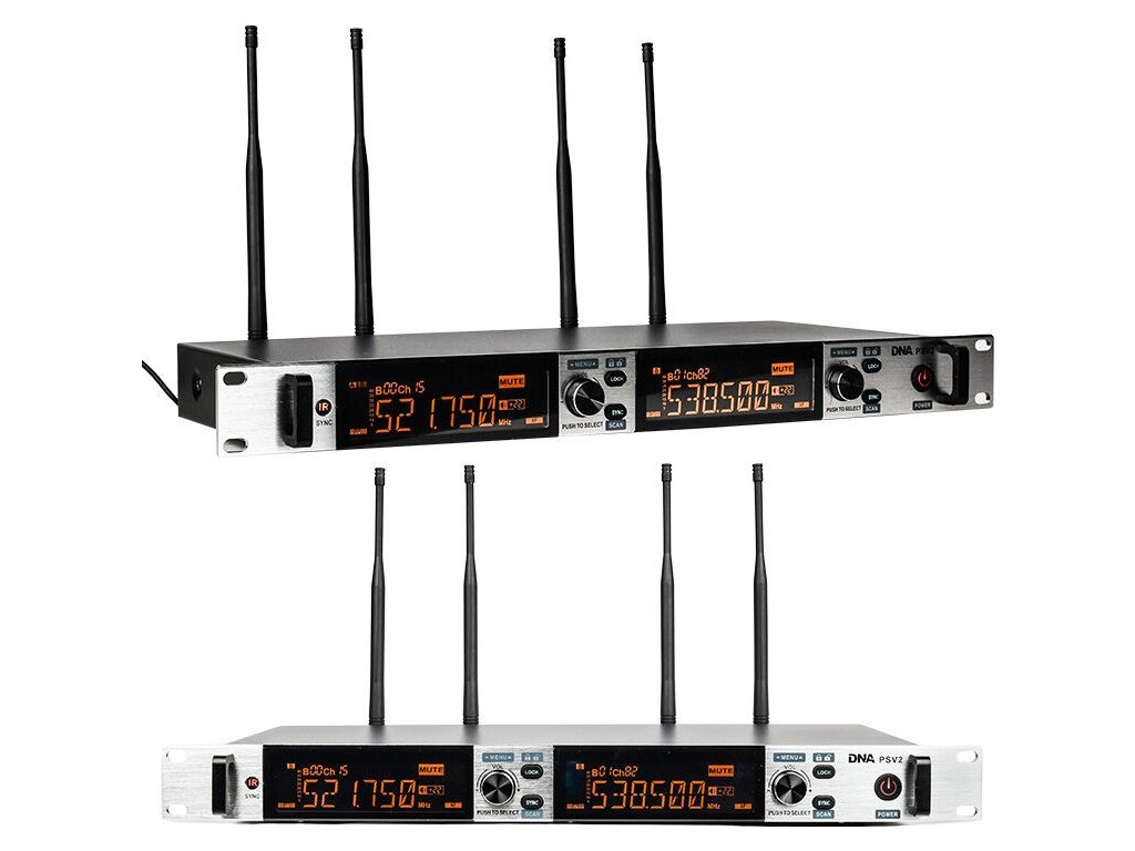 Drugą część systemu DNA PSV 2 stanowi odbiornik fal radiowych (UHF) o zakresie częstotliwości od 518 do 542 MHz. Na tylnej ściance jego obudowy znajdują się wyjścia XLR dla kanałów A i B, wyjście typu Jack (1/4”), złącze zasilania oraz cztery złącza antenowe BNC. Z przodu znajduje się wyłącznik zasilania, dwa potencjometry głośności, odbiornik podczerwieni i podwójny panel sterowania z wyświetlaczem LCD. Wyświetla on aktualne parametry systemu, takie jak poziom sygnału RF/AF, ustawienie częstotliwości odbiornika, wybrany kanał pracy, a także informację o tym, czy mikrofony są aktualnie włączone, czy wyłączone. Za pomocą przycisku SYNC możemy przeprowadzić automatyczne skanowanie, podczas którego urządzeniom systemowym zostanie przypisana wolna od zakłóceń częstotliwość. Zapewnia to wygodę i niezawodność w obszarze profesjonalnego użytkowania.