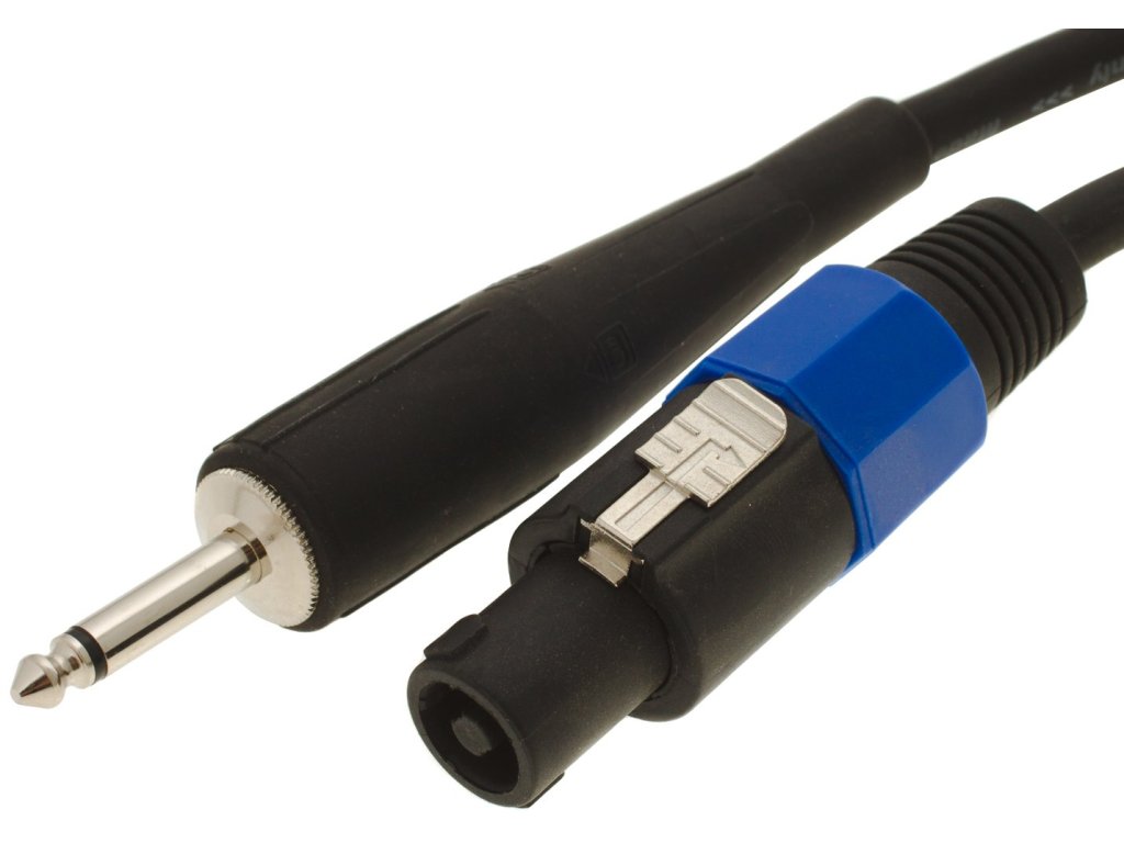 Kabel głośnikowy zasilający serii Python. Kabel składa się z gumowego złącza jumbo jack, złącza głośnikowego i super cichego kabla.