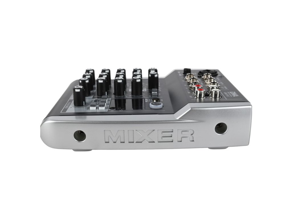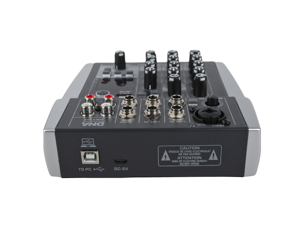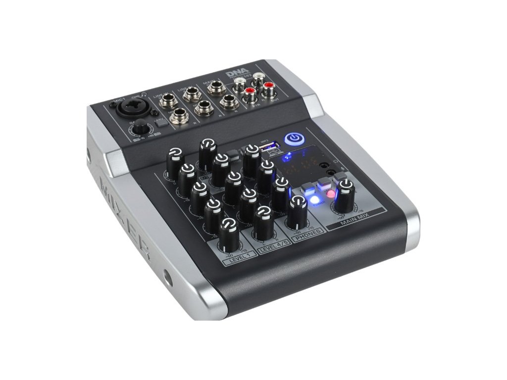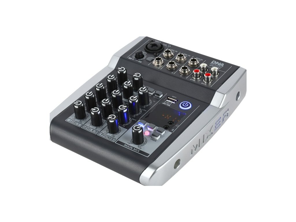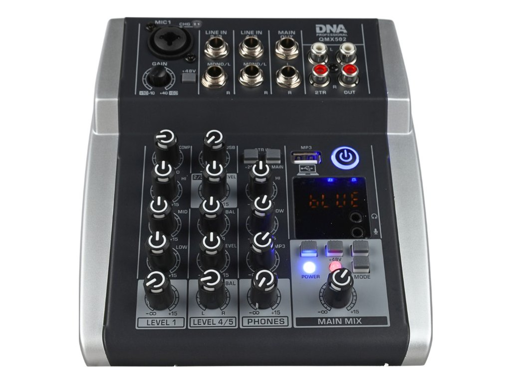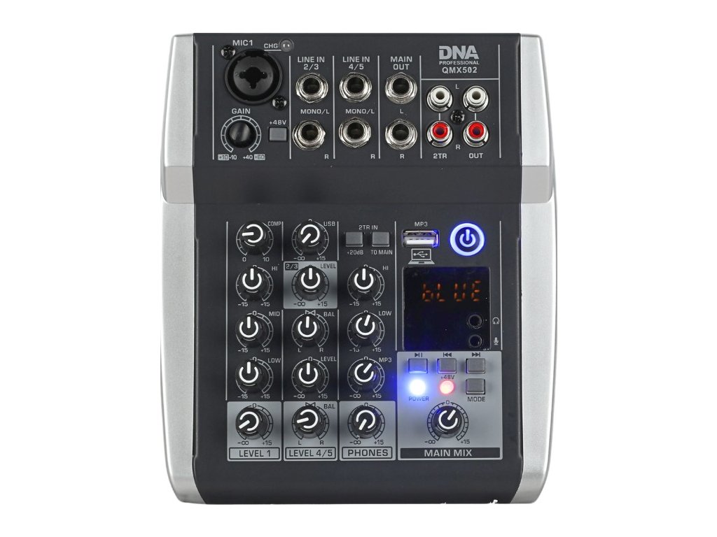 DNA QMX502 to profesjonalny analogowy mikser z interfejsem Bluetooth, wyposażony w pięć monofonicznych kanałów wejściowych, dwa wejścia 2TR, litowo-jonowy akumulator o pojemności 2500 mAh, wyjście słuchawkowe (jack 3,5 mm), wejście mikrofonowe (jack 3,5 mm), kontrolę kompresji i balansu sygnału kanału, zasilanie phantom +48V, złącze USB-B do podłączenia z komputerem oraz intuicyjny odtwarzacz MP3. Urządzenie doskonale sprawdzi się jako mikser sceniczny na mniejsze występy i koncerty, w salach prób, a także w domowym studiu nagraniowym.