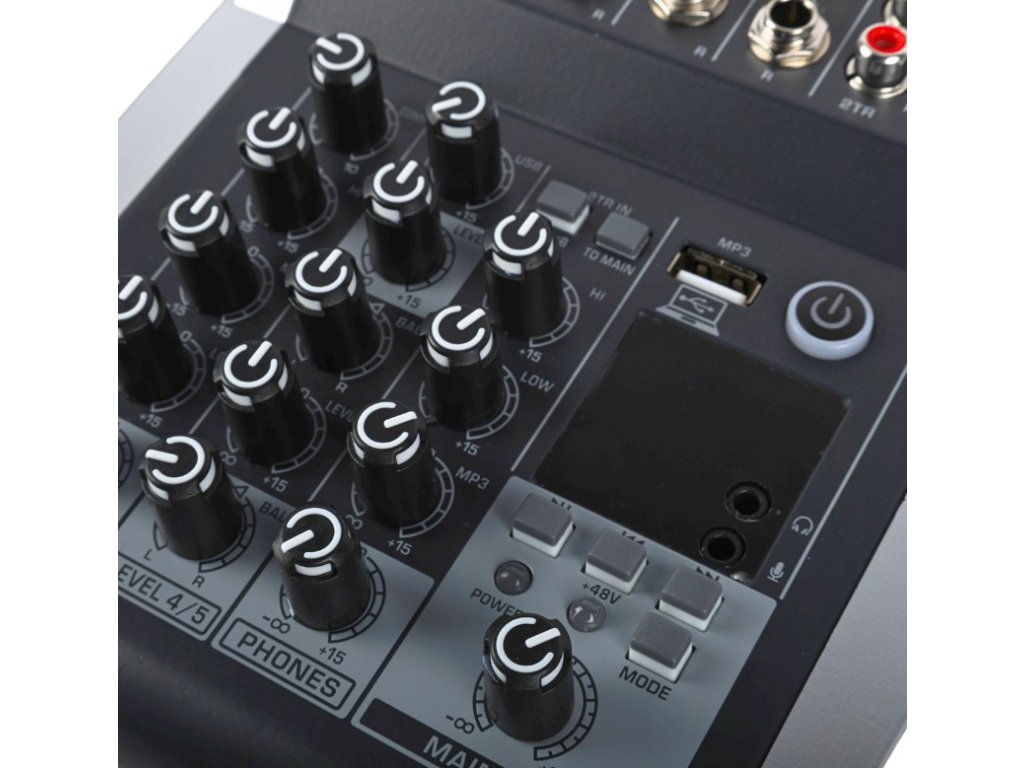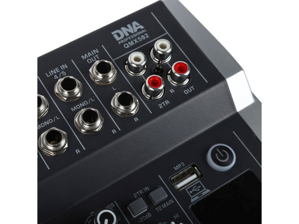 DNA QMX502 jest wyposażony w wejście mono typu combo (XLR/jack 6,35 mm), a także cztery wejścia mono (jack 6,35 mm) oraz dwa wejścia 2TR (RCA/cinch) – dzięki nim możemy podłączyć do miksera mikrofon, ale także gramofon, konsolę DJ-ską lub na przykład instrumenty klawiszowe. Użytkownik może bez problemu kontrolować poziom wzmocnienia (gain) sygnału audio, zakres częstotliwości wysokich, średnich i niskich tonów (3-pasmowy korektor graficzny), poziom kompresji i balansu sygnału kanału, a także ustawić poziom sygnału dla każdego z wejść i wyjść za pomocą wygodnych, ergonomicznych potencjometrów.Dzięki wejściu USB-B na tylnym panelu miksera i dołączonemu przewodowi można szybko podłączyć mikser do komputera. Wbudowany port USB-A umożliwia podłączenie pendrive'a z plikami audio i ich odtworzenie za pomocą intuicyjnego odtwarzacza MP3 sterowanego 3 przyciskami. Funkcjonalność miksera rozszerzają przełączniki wejść 2TR, dzięki którym można zmniejszyć poziom sygnału o +20 dB lub przypisać sygnał wejść 2TR do magistrali MAIN. Kolejną zaletą DNA QMX502 jest także dobrze widoczny wskaźnik ładowania, którego sygnalizacja pozwoli Ci w każdej chwili sprawdzić stan procesu ładowania.