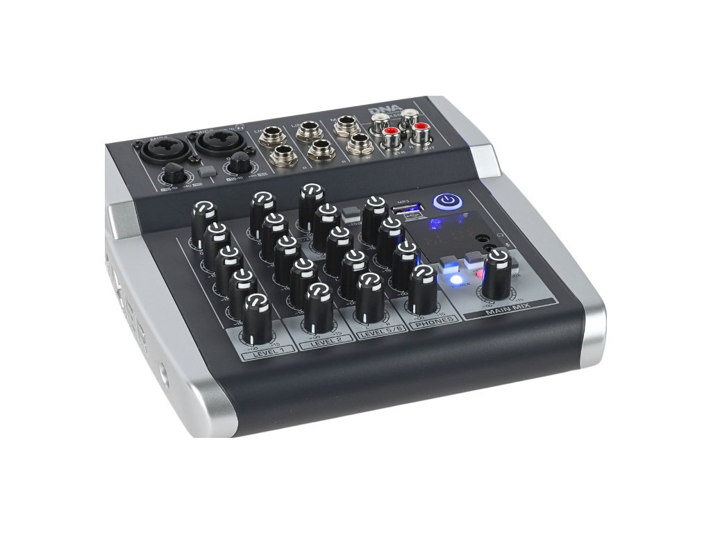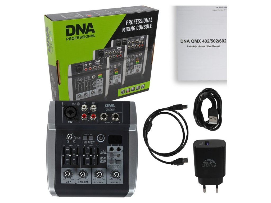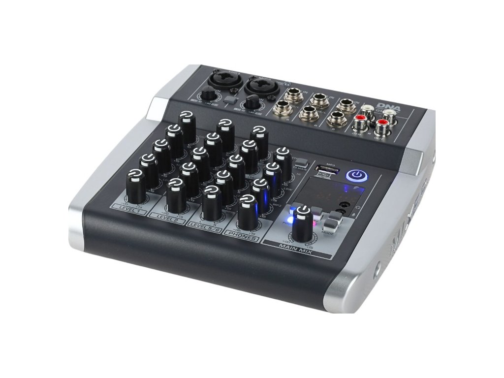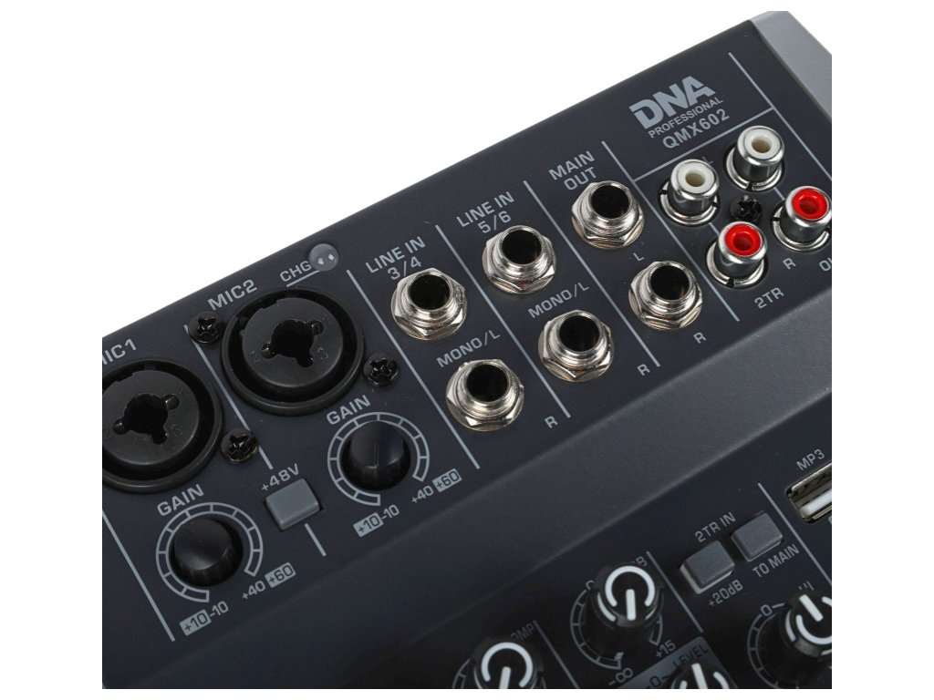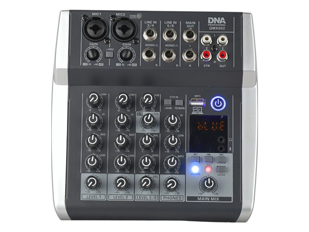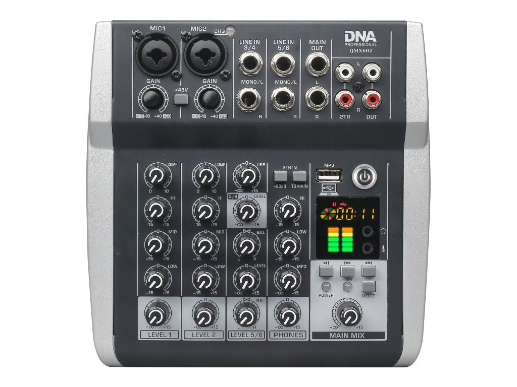 DNA QMX602 to profesjonalny analogowy mikser z Bluetooth, wyposażony w sześć monofonicznych kanałów wejściowych, dwa wejścia 2TR, litowo-jonowy akumulator o pojemności 2500 mAh, wyjście słuchawkowe (jack 3,5 mm), wejście mikrofonowe (jack 3,5 mm), kontrolę kompresji i balansu sygnału kanału, zasilanie Phantom +48V, złącze USB-B do podłączenia komputera oraz intuicyjny odtwarzacz MP3. Urządzenie świetnie sprawdzi się jako mikser sceniczny podczas mniejszych występów i koncertów, w salach prób, a także w domowym studiu nagraniowym.