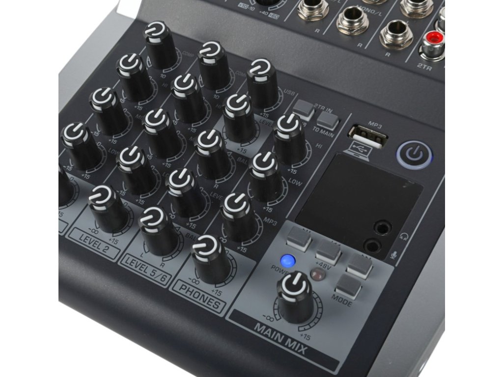 - Złącza wejściowe: 2x XLR/jack 6,35 mm (combo), 4x jack 6,35 mm, 2x cinch (RCA), jack 3,5 mm (mikrofonowe)